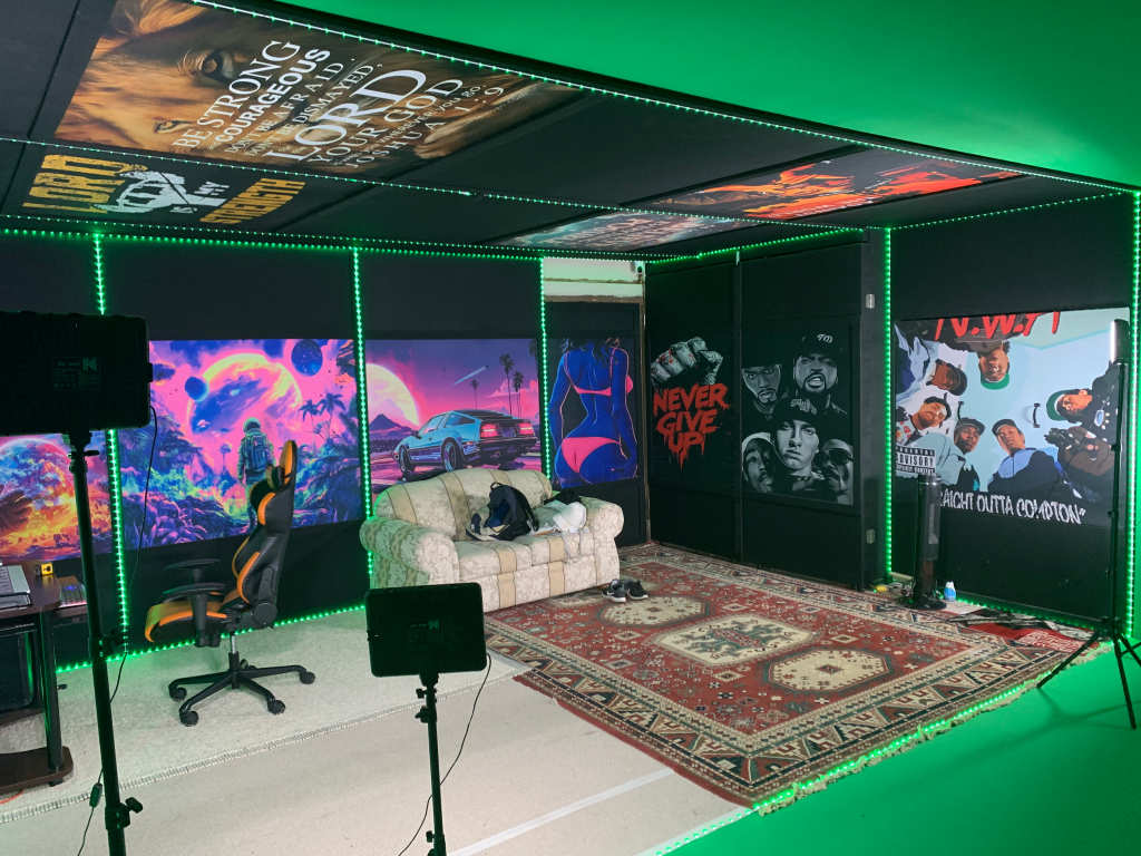 We offer a 20′ wide green screen with four adjustable studio lights.